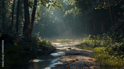 Sunbeams Illuminating a Forest Path and Stream
