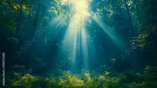 Sunbeams Illuminating a Mystical Green Forest: An Enchanting Nature Scene