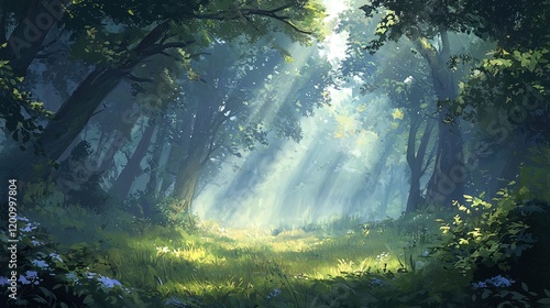 Sunbeams in a lush forest clearing; background shows dense trees; use game design, fantasy illustration