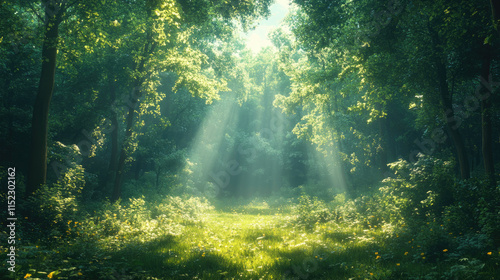forest, wood, tree, sunlight, sunbeam, green, nature, landscape, scenery, path, trail, timberland, greenery, leaf, branch, canopy, magical, mystical, serene, peaceful, tranquil, calm, quiet, solitude, untouched, wilderness, environment, ecology, ecosystem, natural, organic, vibrant, bright, summer, spring, morning, afternoon, light, shadow, ray, beam, growth, flora, vegetation, background, wallpaper, postcard