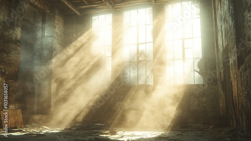 sunbeam, abandoned, factory, building, dust, light, interior, window, brick, old, ruin, industrial, decay, sunlight, ray, gold, beam, shadow, hazy, room, structure, architecture, desolate, empty, forgotten, gloomy, vintage, rust-eaten, broken, weathered, construction, gritty, wall, design