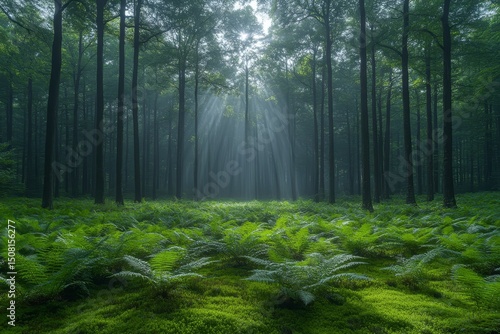 Sunbeams pierce misty forest, ferns carpet the ground. Nature scene, background for peace, tranquility