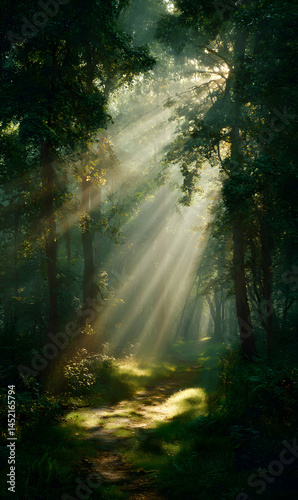 Sunbeams pierce through the canopy of a tranquil woodland landscape creating a luminous ethereal effect