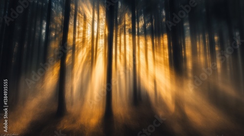 Sunbeams through misty forest