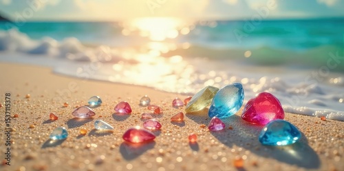 Sun-drenched beach, sparkling jewels scattered across the sand, reflecting sunlight A tranquil scene of nature's treasures Perfect for travel, luxury, and summer themes , summer, travel, turquoise