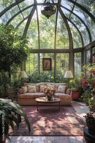 conservatory, glasses, plant, greenery, lush, floral, sofa, seating, table, flower, light, cosy, calm, relaxing, interior, home, decor, design, vintage, garden, nature, tranquil, warm, peaceful, elegant, comfortable, decorative, art, frame, detail, patterned, cushion, potted, chair, lamp, wooden, round, rug, rich, pattern, shade, view, exterior, calmness, bright, homelike