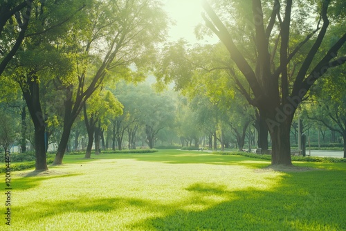 Sun-Drenched Grove: A serene woodland scene featuring towering trees with vibrant green foliage, bathed in the warm glow of the morning sun, casting long shadows on the lush green grass.