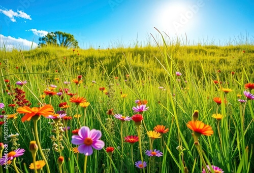 Sun-drenched meadow bursts with vibrant spring wildflowers under a brilliant blue sky, pastel, sunlight