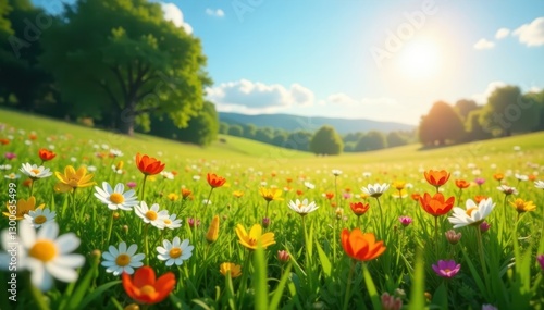 Sun-drenched meadow, vibrant wildflowers bloom , tranquil, texture, image