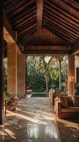 villa, tropical, garden, pool, sunlight, luxury, interior, design, architecture, window, patio, furniture, sofa, chair, stone, floor, wood, roof, plant, foliage, tranquil, relaxation, natural light, open space, modern, minimalist, elegant, peaceful, serene, resort