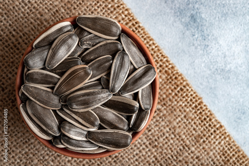 Sunflower seeds in their shells in a wooden bowl, top view