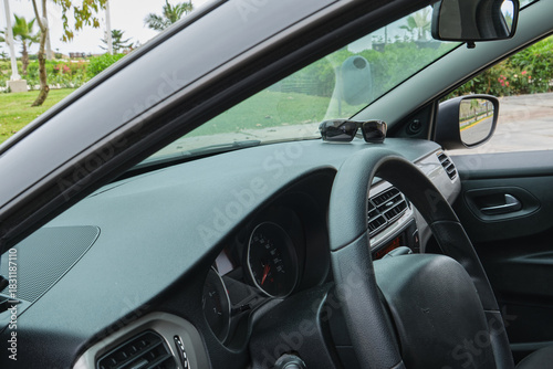 Sunglasses resting on the car dashboard in a parked vehicle, ready for travel