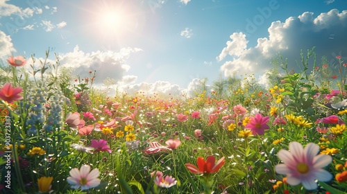 Sun-Kissed Meadow: A vibrant tapestry of wildflowers blooms under a radiant sun, painting a scene of summer's vibrant beauty. The lush green grass, fluffy white clouds