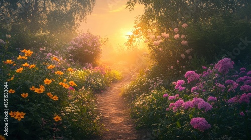Sun-Kissed Pathway, A Floral Haven Bathed in Golden Morning Light