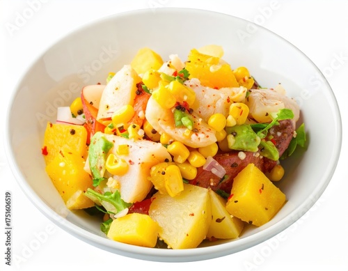 SunKissed Tropical Ceviche A Zesty Medley of Seafood Mango and Corn Isolated on White.