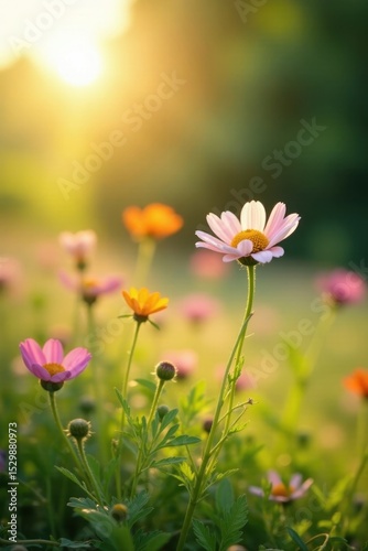 Sun-kissed wildflowers dance in gentle breeze, soft focus backdrop , romantic, spring, peaceful