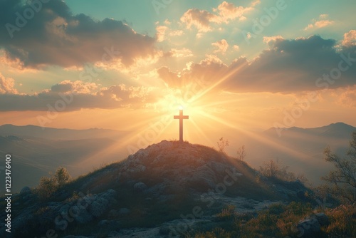 sunrise, cross, hilltop, sunlight, cloud, ray, nature, spirituality, landscape, morning, faith, serene, peaceful, sky, religious, dawn, mountain, silhouette, light, hope, calmness, worship, natural, beauty, inspiration, sunbeam, scenic, outdoors, heavenly, meditation, calm