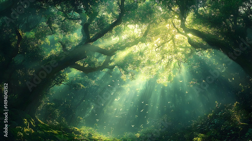forest, sunlight, tree, canopy, green, lush, nature, light, beam, daylight, shadow, branch, leaf, moss, ground, flora, vegetation, environment, landscape, illumination, glowing, bright, fresh, tranquil, peaceful, serene, vibrant, detail, texture, depth, perspective, ambient, soft
