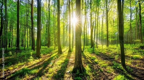 Sunlight Filtering Through a Lush Green Forest in Spring
