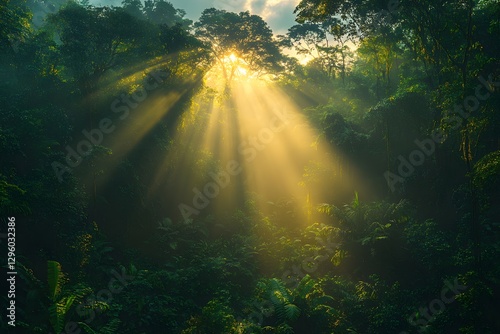 Sunlight Filtering Through Lush Jungle Canopy at Dawn - Nature's Serenity