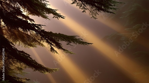 Sunlight Filtering Through Tall Evergreen Trees in a Mystical Forest Landscape during Early Morning Hours with Beautiful Natural Light Effects
