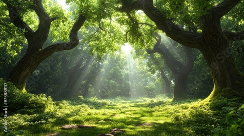 forest, tree, sunlight, green, nature, lush, beam, light, natural, outdoors, leaf, wood, environment, bright, fresh, peaceful, magic, glow, branch, summer, calmness, landscape, serene, vibrant