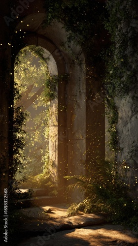 Sunlight filters through an ancient stone archway overgrown with lush greenery and softly falling particles.