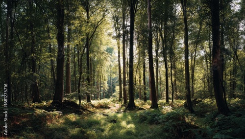 forest, tree, sunlight, path, timberland, nature, green, leaf, wood, daylight, canopy, sunlit, shade, landscape, beauty, calm, tranquil, scenic, verdant, dense, plant, fern, light, shadow, atmosphere, photo, evergreen, lush