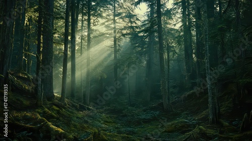 Sunlight filters through misty evergreens in a serene mountain forest.
