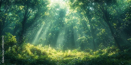 Sunlight filters through tall trees in a vibrant green forest creating a serene atmosphere