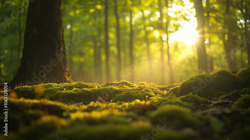Sunlight filters through trees, illuminating lush green moss on the forest floor during a serene morning