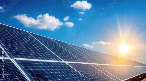 Sunlight hits solar panels under a clear blue sky, showcasing renewable energy technology and environmental sustainability.