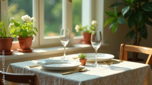Sunlight illuminates a table setting with elegant tableware, showcasing a serene and inviting atmosphere for a quiet meal.