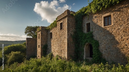 Sunlight illuminates ancient stone building, casting golden hue on scene. Building, overgrown with green ivy, stands amidst lush landscape. Various stages of decay evident, with some windows intact.