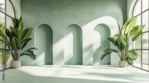 green, plant, room, interior, design, architecture, window, arch, wall, sunlight, empty, space, home, house, modern, style, decoration, light, shadow, potted, floor, tropical, leaf, nature, indoor, apartment, minimal, elegant, luxury, bright, nobody, large, illustration, rendering, contemporary, minimalism, freshness, serene, peaceful, tranquil, simplicity, elegance, natural light, airy, roomy, home decor