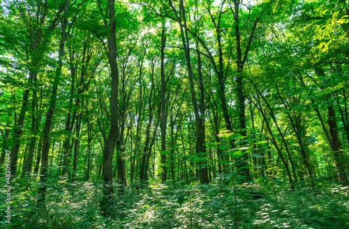 Sunlight in the green forest, spring time
