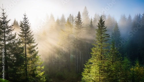 Sunlight passing through morning mist in a dense pine forest, creating an ethereal, dreamy atmosphere.