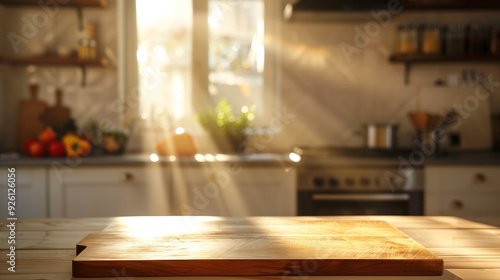 Sunlight shines through the kitchen window, illuminating a wooden board in the foreground. The kitchen looks modern and cozy