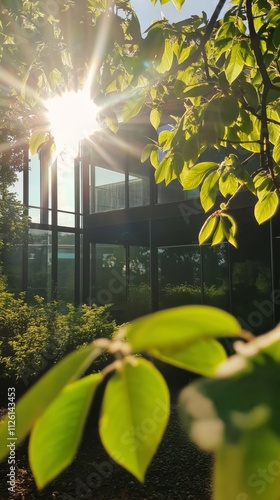 sunlight, leaf, green, tree, glasses, building, natural, light, outdoors, environmentally friendly, architecture, sustainable, nature, environment, sunny, foliage, window, brightness, urban, shade, growth, modern, transparent, fresh, daylight, energy, greenery, day, lens, flare