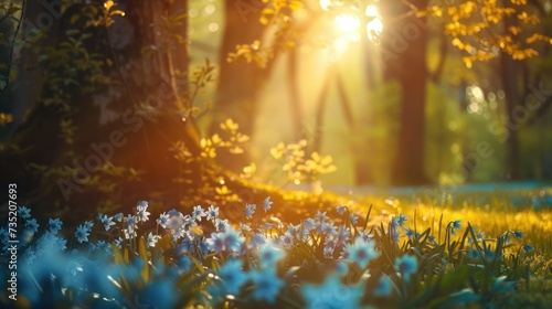 Sunlight shining through the trees and illuminating the beautiful flowers. Perfect for nature-themed designs and wallpapers