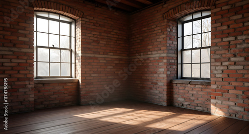 brick wall, corner, sunlight, window, window, wooden floor, hardwood floor, industrial, loft, interior, architecture, design, space, background, texture, pattern, light, shadow, beam, rustic, vintage, old, building, room, interior design, empty, blank, copy space, real estate, property, home, house, apartment, warehouse, factory, studio, photo, scene, setting, template, composition, perspective, natural light, warm light