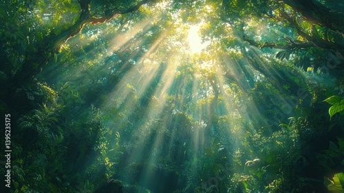 Sunlight streaming through a dense jungle canopy, illuminating lush green foliage and vibrant flora