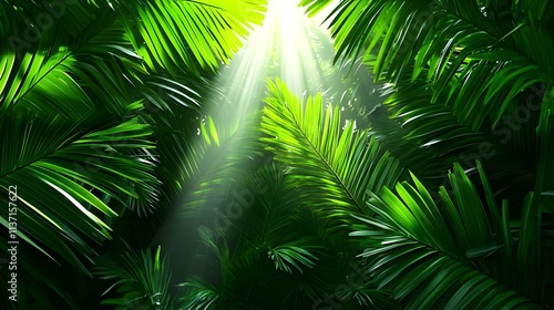 Sunlight Streaming Through Dense Tropical Palm Leaves, Illuminating a Lush Green Jungle Canopy in a Serene and Vibrant Natural Forest Environment