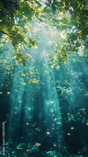 sunlight, streaming, leaf, looking up, tree, underwater, fish, swimming, bubble, shining, forest, natural, sunbeam, turquoise, aquatic, water, flora, foliage, plant, growth, clear, tranquil, environment, duck pond, ray, scenery, scene, fresh, wildlife, ecosystem, calm, daylight, wood, park, spring, summer, tropical, travel, background, vertical, green, freshness, undersea, illuminating, beam of light