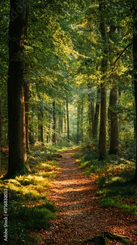 forest, path, tree, sunlight, nature, wood, trail, green, landscape, peaceful, serene, walk, hike, outdoors, adventure, environment, beauty, travel, explore, summer, spring, autumn, foliage, leaf, canopy, light, dappled, timberland, pathway, journey, destination, scenic, calmness, calm, wilderness, ecology, ecosystem, natural, perspective, vertical, vibrant, fresh, bright, shadow, season, earth, growth, plant, flora