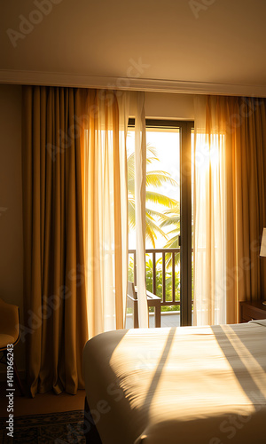 hotel room, bedchamber, balcony, curtain, sunlight, sunrise, window, doorway, palm tree, tropical, resort, travel, vacation, bed, interior, light, warm, peaceful, relax, morning, get-away, leisure, holiday, destination, view, apartment, luxury, serene, idylli, calm, comfort, elegant, relaxation, escape, nature