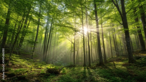 Sunlight Streams Through A Lush Early Spring Forest Illuminating The Fresh Green Leaves And Creating A Serene And Magical Woodland Atmosphere