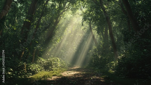 Sunlight streams through a lush forest