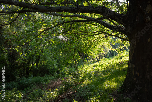 forest, tree, sunlight, green, leaf, nature, wood, trunk, light, shadow, landscape, sun, summer, plant, growth, environment, daylight, scene, timberland, path, underbrush, branch, sky, flora, outdoors, natural, peaceful, calmness, fresh, vibrant, serene, wild, sunbeam, gold, lush, foliage, beauty, closeup, detail, texture, surface, bark, horizontal, angle, view, peace, calm, ecosystem, earth
