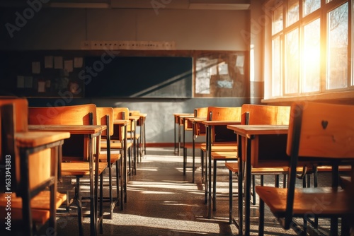 Sunlight streams through windows into an empty classroom with wooden desks and chairs, creating a warm and inviting atmosphere